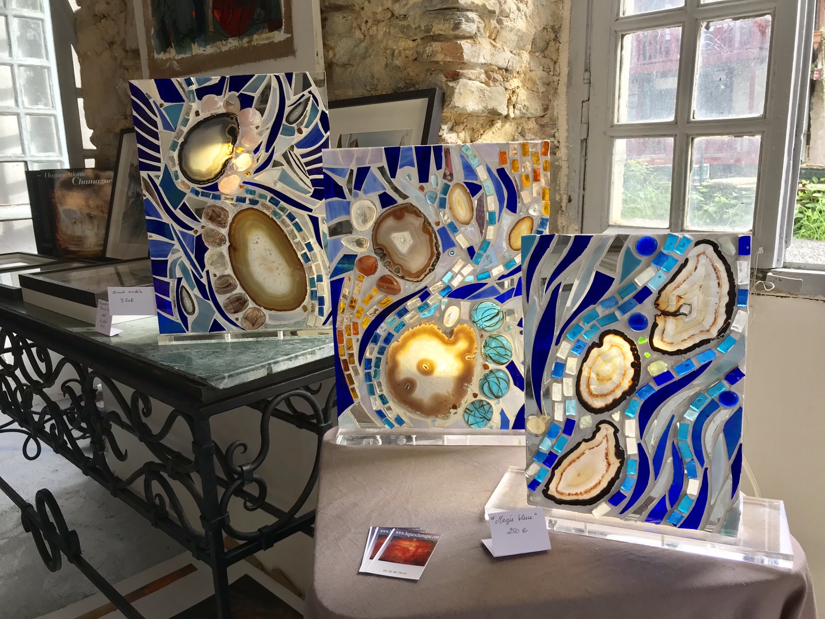 C’est ainsi que Hughes Chamagne, artiste reconnu au style éclectique, à la fois peintre, sculpteur, aquarelliste, jonglant entre couleurs et matières, dans un art abstrait et semi-figuratif, a pu exposer librement dans l’ appartement privé de Cécile fondatrice d’ Art en Loft, et chez Bernard Mercadier, propriétaire des murs d’un ravissant immeuble au centre du village historique, sur la place Jeanne d’Albret.